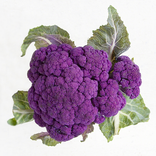 Purple Cauliflower is vividly violet on the outside florets with light cream color stalks and core. The entire plant (floret, stalk and leaves) is edible.  Despite its color, this variety tastes similar to traditional cauliflower, though the flavor can be a little stronger.
