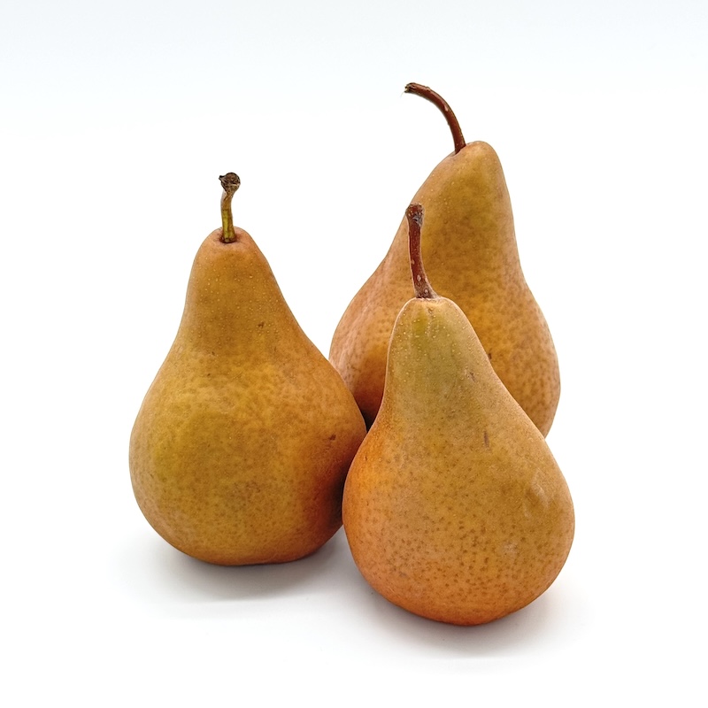 Bosc Pears are the quintessential pear shape, having a long curved stem and an elongated neck that gradually ends in a rounded bottom. Bosc Pears have a golden russet-colored skin and creamy, off-white flesh that is tender yet crisp, dense and juicy.  They have a pleasantly sweet flavor with hints of fall spices and an intense honeyed aroma.
