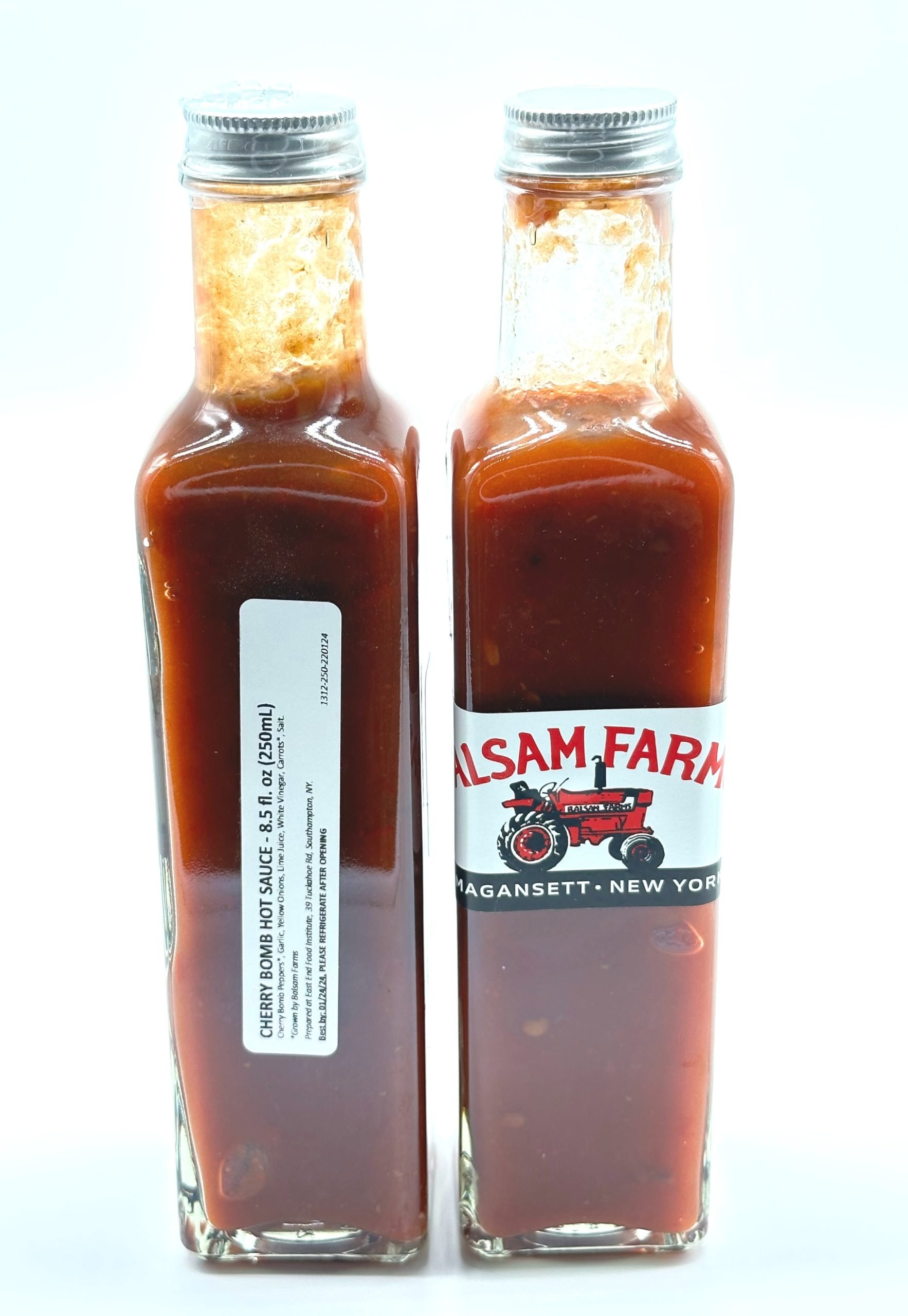 Cherry Bomb Hot Sauce made from Balsam Farms fresh hot peppers.